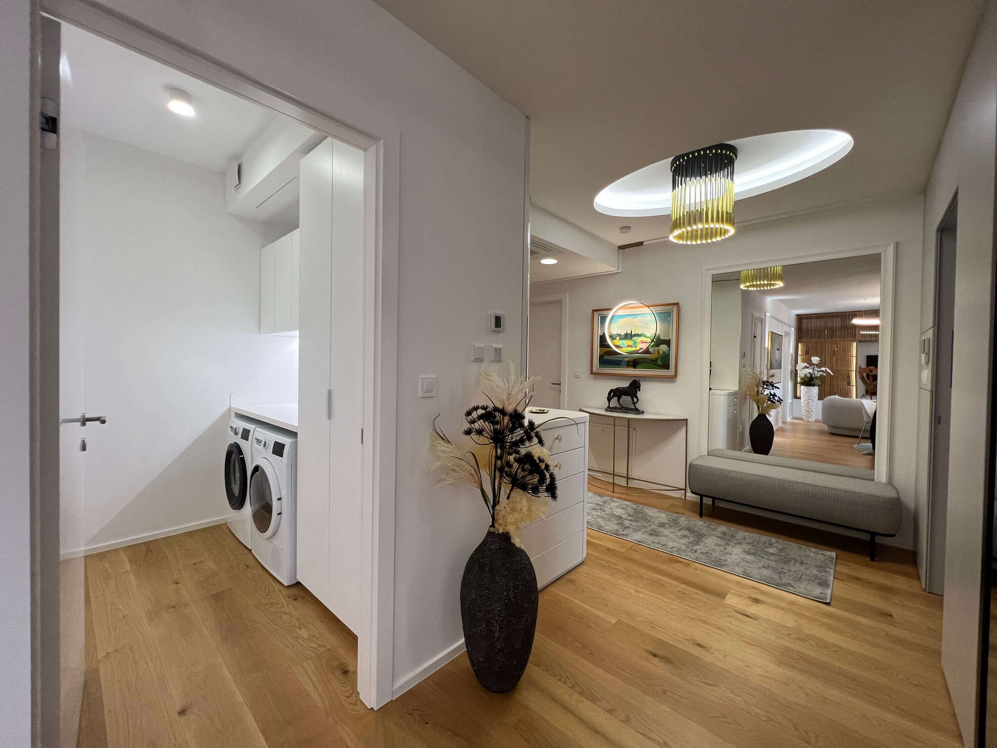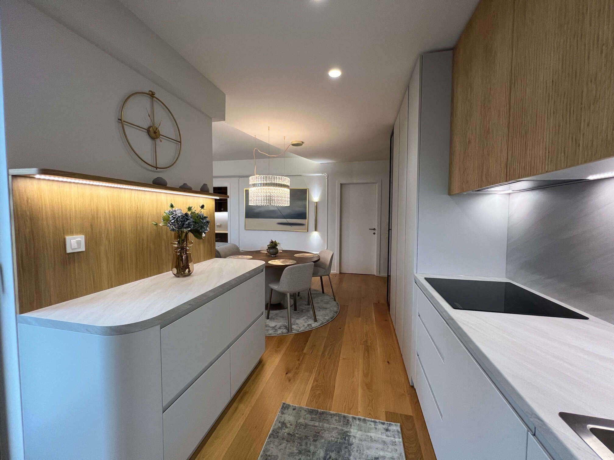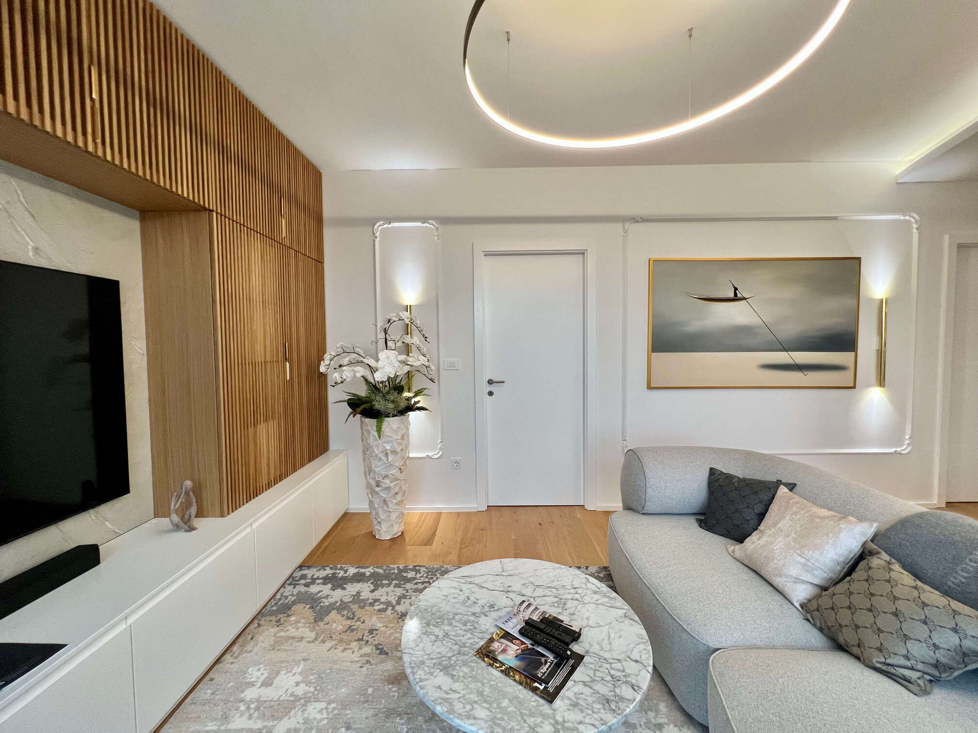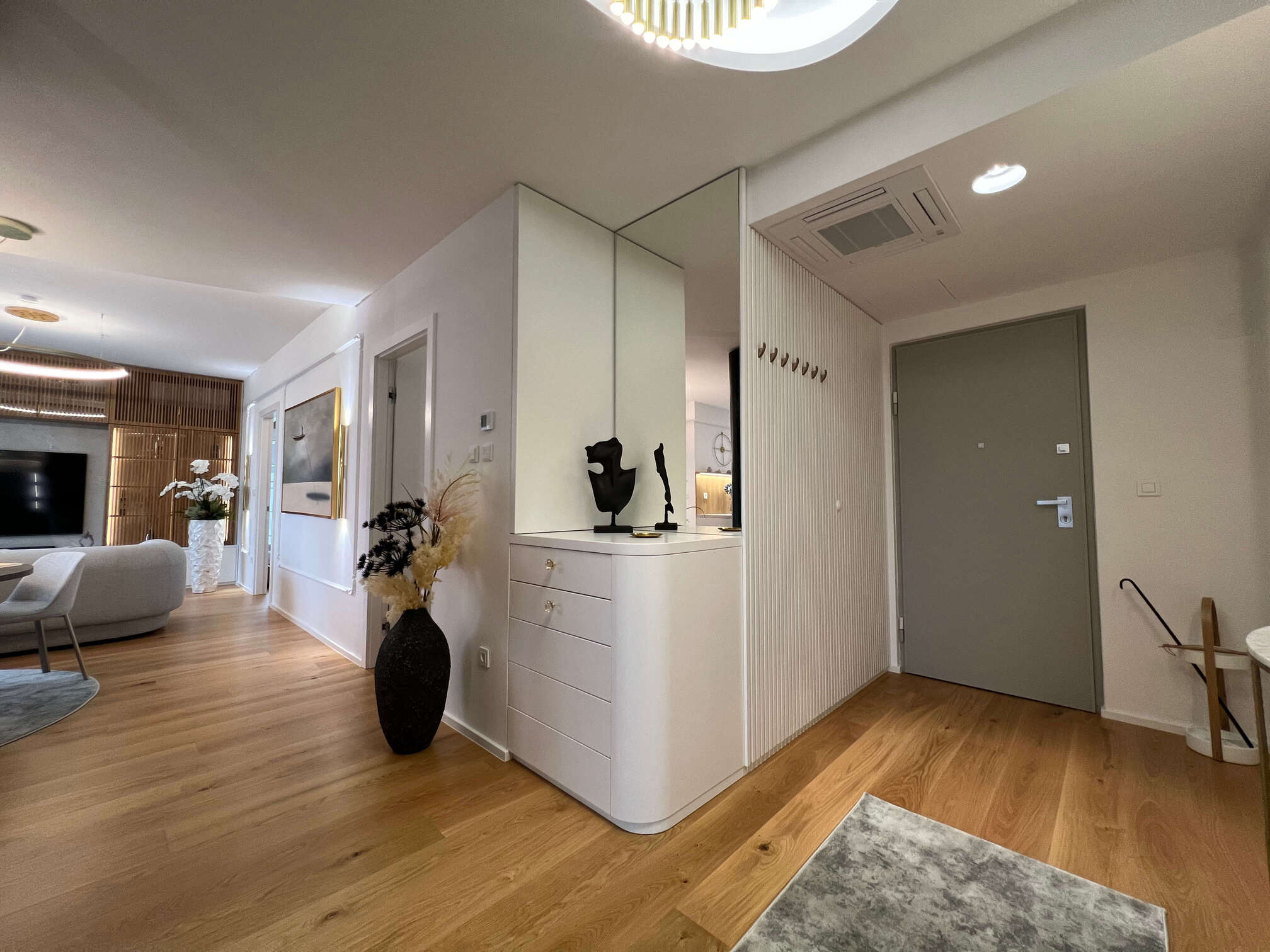 U središtu ove prostorne preobrazbe nalazi se i naš parket, koji svojom prirodnom toplinom, svijetlim tonovima i pomno odabranom teksturom nadopunjuje smirenu paletu boja u stanu te naglašava osjećaj doma. Parket je pažljivo integriran kao ključni materijal koji cijelom interijeru daje opipljiv karakter i osjećaj trajnosti.